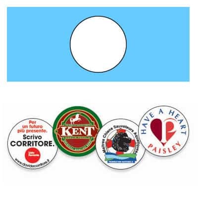 Foglio calamitato a forma di cerchio, dello spessore di 1,5 mm con un diametro di 42 mm. Personalizzazione in quadricromia.