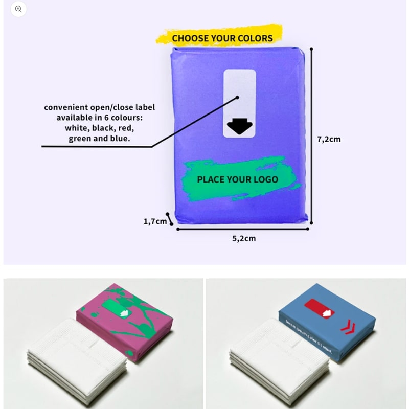 ogni pacchetto comprende 5 fazzolettini 21x21 cm a 4 veliPersonalizzazione full color a 360°forniti singolarmente oppure blisterati da 3, da 6 o da 9 pz.produzione in 10 giorniogni particolare è completamente biodegradabile250 pacchetti per scatola